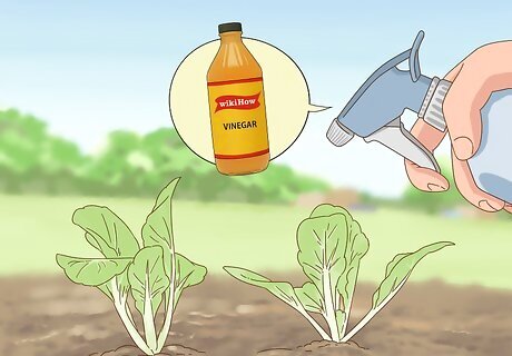 Spray vinegar or apple bitter on vegetables. Pungent odors like white vinegar or apple bitter have been shown to repel dogs and other creatures, but these stinky liquids are perfectly safe for vegetables and plants. Fill a spray bottle with white vinegar or apple bitter and give your garden a spray after watering. White vinegar is available at most grocery stores. Apple bitter is available at most pet stores.