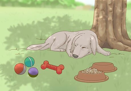Create a dog-friendly space. You can encourage your dogs to stay away from the garden by providing a better space for them to play. If you like having the dogs with you in the yard, this is great way to keep them happy and enjoy their company. Choose a location. Dogs tend to prefer shade. Provide enough space for dogs to play and relax. Select a dog-friendly surface. The top choice is a sand/soil mixture, but wood chips or leaves will work too. If your dog likes to dig, build him his own sandbox and encourage him to dig there instead. Provide some toys and a dish with water. Use positive reinforcement to encourage dogs to hang out in this space.