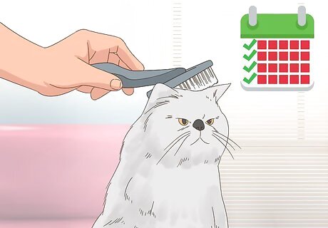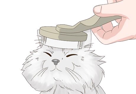 Brush your cat’s coat weekly. In order to keep your cat’s coat nice and manageable, you should try to brush your cat’s coat at least once every week. Use a fine-bristled brush intended for use on cats and run it along the length of your cat’s body. Be sure to introduce your cat to the brush slowly, as it might be afraid of it at first. Show the cat the brush and let the cat get used to it as an object. Then let the cat rub up against it and start brushing the cat.