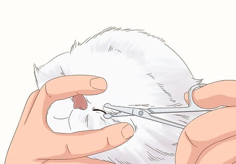 Trim the hair. Use the blunt-nosed scissors to cut the hair in a line that is parallel to the cat’s eyelid. Cut the hair in as a straight a line as possible, following the line of the eyelid. Be careful not the cut the hair too close, as you might risk cutting the cat’s skin in the process. This method is especially important to adhere to in breeds like Persians who have skin that folds near the eyes.