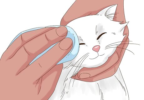 Clean mucus immediately. If you see mucus building up in your cat’s eyes, wipe it away immediately. This mucus buildup can lead to unsightly discoloration of the fur beneath the eye. Use a damp warm wash cloth to gently remove any mucus that is collecting around your cat’s eyes. If your cat is prone to eye infections, you should use a sterile eyewash or eye wipes to remove the mucus and clean the area each time you wipe.