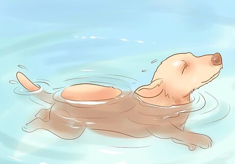 Let your pup practice their doggie-paddle. If you have a dog breed that enjoys the water, take your dog to a lake or pond and let them swim. Swimming is great exercise for dogs, and the experience of being in the water engages their senses. For dogs, one minute of swimming is the equivalent of four minutes of running! The resistance of the water makes them work harder to swim than they have to work to run on land, and this improves their overall muscle tone.