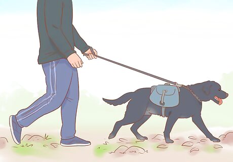 Go on a hike or walk. After a long weekend indoors, make sure to give your dog some much-deserved time outside in nature. Take them on a long walk or hike a nearby trail. For your dog’s safety and comfort, try to choose a trail with a soft leaf-covered track, without any sharp rocks or steep drop-offs. Give your dog their own backpack in which to carry water, food, and treats. Make sure that the pack fits snugly and doesn’t chafe their belly or sides.