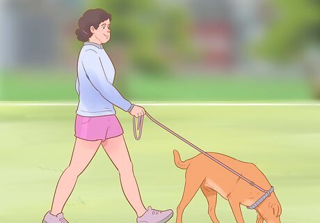 Take a long, brisk walk first thing in the morning. Before you leave for work, enjoy some time with your canine friend, and expel some of their energy by taking a walk together. You will both enjoy the exercise, and your dog will be able to have some time outside before they are cooped up inside the house all day. A 20-minute walk daily is recommended for most breeds of dogs. Working dogs may need two 20-minute walks a day.