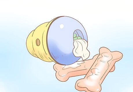 Gather up interactive treats. You might want to start with purchasing a Kong (or two) from your local pet store, a hard rubber toy that can be filled with dog food and stuffing (such as peanut butter or Kong stuffing, small dog biscuits or milk bones). Your dog will have to work at getting the treats out of the cavity of the toy, and this can keep them entertained for hours.