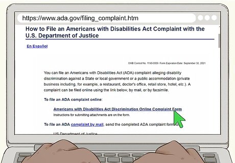 File an administrative complaint with the state or federal government. If the manager isn't willing to accommodate you, or if the alternative isn't suitable, you can file a complaint and a government agency will review the situation. Some state government departments also review complaints of violations of disability rights. To file an ADA complaint with the US Department of Justice, go to https://www.ada.gov/filing_complaint.htm and click the link to start an online complaint. If you want to mail in a written complaint, send it to US Department of Justice, 950 Pennsylvania Ave, NW, Civil Rights Division, Disability Rights Section – 1425 NYAV, Washington, DC 20530. To find state agencies that take complaints regarding violations of disability rights, do a search for "disability rights violation complaint" with the name of your state. Before you enter any information, make sure the website is an official government website. If it doesn't end in ".gov," it should say on the home page or "about" page whether it is affiliated with any government agency.