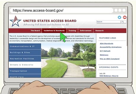 Evaluate access guidelines and standards. The US Access Board develops the standards that businesses and state or local governments must follow to ensure their facilities and services are accessible to all people with disabilities. While the Board's guidelines aren't mandatory, they also provide information that can help businesses and state or local governments ensure they are as accessible as possible. If you want to review the US Access Board guidelines and standards yourself, go to https://www.access-board.gov/ and select the category of standards you want to learn about. The Board also has meetings and other events in Washington, D.C. that are open to the public. If you're not able to travel to D.C., you might also try the Board's webinars, which discuss standards and guidelines in various sectors.