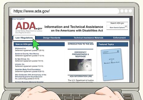 Read about state and federal disability rights laws on your own. The main federal law that protects the rights of people with disabilities is the Americans with Disabilities Act (ADA). However, there are other federal laws that also protect your rights to education and protect you from discrimination and harassment. The state you live in may also have its own laws that go above and beyond the requirements set by federal law. You can find a lot of information and resources on the ADA website at https://www.ada.gov/. There are other government agencies that also have responsibilities under the ADA and may be able to help you understand your rights in particular areas. A list of these agencies with links to their websites is available at https://www.ada.gov/ada_fed_resources.htm. To find information about your state's laws, type the name of your state in a search engine along with the words "disability rights." Scroll through the results to find information about the laws in your state.Tip: If you have questions about the ADA or ADA accessibility requirements, you can call 1-800-514-0301 (TTY: 1-800-514-0383).
