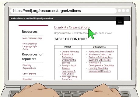 Join organizations that advocate for disability rights. Some organizations advocate for the rights of all disabled people while others represent a single disability, cause, or issue. Research organizations that deal with issues that concern you and join the ones you like the most. The National Center on Disability and Journalism has a list of reputable organizations available at https://ncdj.org/resources/organizations/. This list is probably a good place to start if you're looking for organizations you might be interested in. You can also ask friends with disabilities what organizations they recommend or are members of.Tip: Carefully evaluate the background of any nonprofit before you join or donate any money. Make sure you're comfortable with everything the nonprofit supports and how it spends its money. You can find this information on websites such as https://charitycheck101.org/ and https://www.charitywatch.org/.