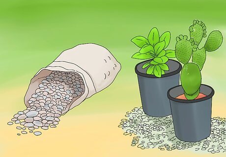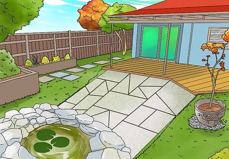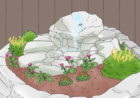 Put a fountain in your yard for visual interest. Remove all the topsoil in the area where you want to place your feature. Make sure the base layer is level and packed tight with stone dust. Set the base on top of your packed stone dust and use a level to make sure it sits flat. Feed the pump line through the fountain and fill the fountain with water. Use a solar-powered pump so you don’t have to run electrical wires underground. Look for a fountain that fits the style of your landscaping. Browse landscaping stores to find a fountain that’s right for you.