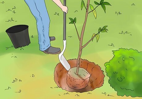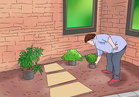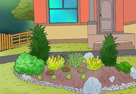 Plant trees first. Trees are the largest parts of your landscape and should be prioritized so you can plan around them. Choose a place in your yard where your tree will fit once it’s reached its full size. Pick up a young tree from your local nursery so it’s easier to transport and plant. Dig a hole slightly wider and deeper than the tree’s root system and put your tree in the ground. Water the tree every day for the first 3-4 weeks so it can establish roots. Tie the tree trunk to stakes to help it grow straight and prevent wind from blowing it over. Choose evergreen trees if you want shade in your yard throughout the entire year. Pick deciduous trees that lose their leaves yearly if you just need shade in the summer.
