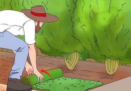 Roll sod across your lawn if you don’t want to grow grass. Sod is pre-grown grass that’s rolled up and easy to lay in your yard. After measuring your yard and determining how much sod you need, lay it down along the edges of your yard first. Work in a brick-like pattern until your entire yard is covered. You may need to cut pieces of sod to fit around curves or obstacles already present in your yard. Look at the nearest landscaping store to see what types of grasses they offer.