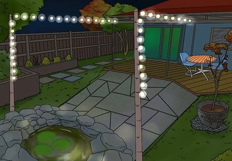 Place lights around your yard to illuminate it. Lights will make your outdoor space beautiful even at night! Look for solar-powered lights so you don’t need to run wires through your yard. Put the lights around pathways so guests can see where they’re walking or use floodlights to illuminate a prominent piece of your landscaping, such as a sculpture or large plant. Outdoor lighting can be purchased at any home and garden store. If you want lighting that you can control with a switch, hire a landscaping specialist to help run wires underground.