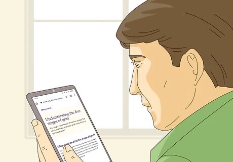Understand the five stages of grief. These stages could more accurately be described as cycles. You may skip stages, never experience other stages, and you can find yourself stuck in stages. But you may experience some or all stages in waves repeatedly. These stages are: Denial and isolation: This stage involves denying the reality of the situation. It is a natural response to overwhelming pain caused by grief. Anger: This stage emerges once the denied pain starts to surface. Anger can be aimed at inanimate objects, strangers, family or friends. You may feel angry at the person who died or left, and then you may feel guilty for feeling angry. Bargaining: In this stage, you may feel like you need to regain control from feeling helpless. You might worry about how you should have been a better person, or you should have gotten help sooner, and so on. Depression: This stage brings sadness and regret that comes with the realization that the loved one is truly gone. You may feel overwhelming sadness, crying, and so on. Acceptance: This stage may be characterized by reaching a state of calm and withdrawal. Some people may never reach this stage of grief.