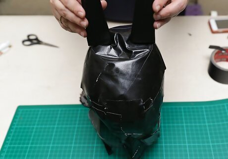 Cover the plastic bag in duct tape. Tear off 5-8 inch strips of duct tape and attache them to the bag. You will cover the entire bag creating a helmet made of duct tape. Be careful not to stick the duct tape to your skin or hair and only attach it to the plastic. You may find it easiest to begin at the top of your head and work your way around to the front, sides, and back. Tape across the plastic covering your forehead. The duct tape should come down to your eyebrows before smoothly transitioning down over your ears and around the back of your neck. For best results, use black duct tape. Doing so will be easier than attempting to color silver duct tape later.