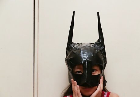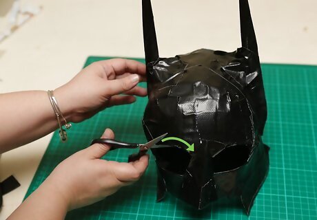 Sculpt and trim the mask. Remove the mask from your head. Use additional layers of plastic bag material and duct tape to define the eye holes, nose, and lower edge. Fill the mask with wadded grocery bags to prevent the mask from caving in as you work. The mask eyes should be a defined "almond" shape. The holes should be about twice as large as the shape of your eyes. Use tape to create a smooth edge along the nose and the rest of the lower edge of the mask. Trim away any visible plastic. If desired, you could also cover the mask with another layer of tape to hide any uneven, criss-crossing tape lines and provide the mask with more support and structure.