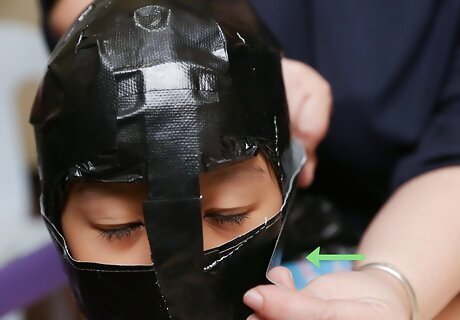 Make a nose covering. Fold a 4 inch strip of duct tape in half lengthwise. Tape the strip to the center of the forehead portion of your mask extending down between your eyes and over your nose. Attach two more folded 6 inch strips of duct tape from the nose piece extending outward to your ears. This will create a "T" shape that goes between and under your eyes and covers your nose. Make sure that you do not cover your mouth. Leave spaces for eye holes. Apply more duct tape, as necessary, to create a snug fit around your cheeks and nose.
