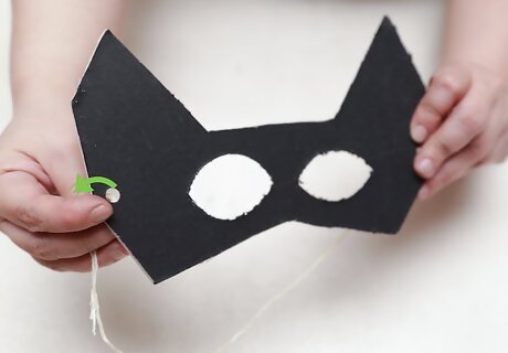 Attach a string to the mask. Use a hole punch to create a hole on each side of the mask. Tie a string to each end of the mask. Tie one end of the string and hold the mask up to your face. Wrap the string around the back of your head to measure how long to make the string before tying it to the other side of the mask. Reinforce the holes and attached string with a piece of tape to avoid tearing the mask when you wear it.