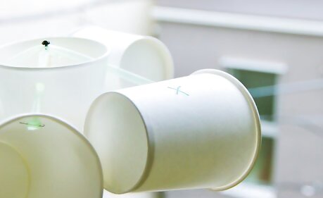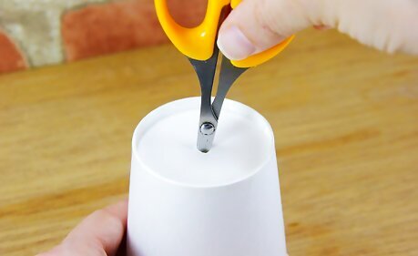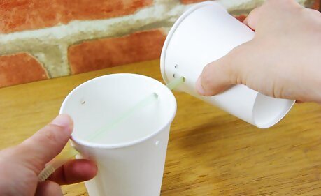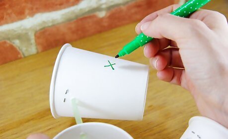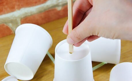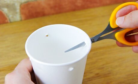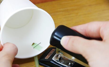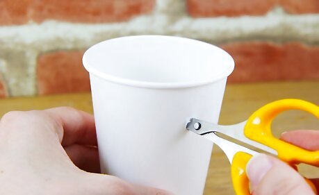 Make one incision on four cups. Use plastic or paper cups. Use scissors to cut out a hole that is large enough to insert a straw or small stick. You should make the hole a little less than halfway down the cup. This is where your cup will connect to the center cup. Note to kids: use scissors under adult supervision.