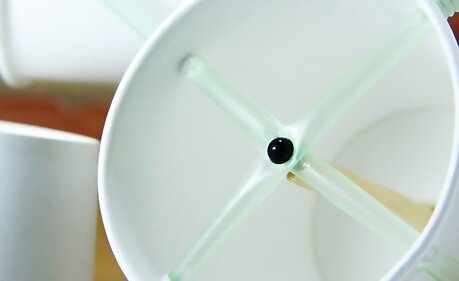 Push two straws through the center cup. Each straw should enter at one side of the center cup and exit on the opposite side through two of the top holes. The straws should cross in the middle and form an “X” in the center of the cup. Be sure to center the straw so that there is the same length of straw on each side of the cup. These are the straws that are already attached to two outer cups. Don’t forget to account for the length of straw that is inside your two outer cups.