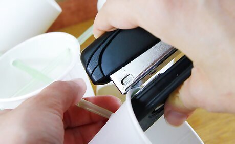 Staple a straw to two of the outer cups. Push the straw through the hole of the outer cup until it reaches the opposite edge. Then bend the end of the straw that is touching the opposite edge down against the inside edge of the cup. Staple the straw into place. Repeat this process for a second cup, but not for all four cups. The last two cups will be assembled differently. For children: have a responsible adult present for stapling.