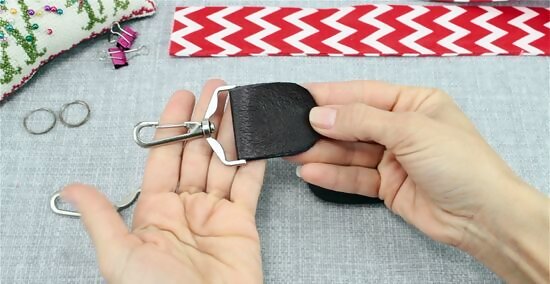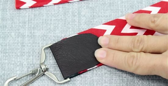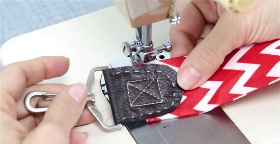 Repeat this process with the opposite end piece and strap. Fold the other section of your end piece material around the loop, chain, or buckle of the metal clasp. After folding the vinyl or faux leather material in half and sliding it onto the other end of the strap, use a needle and thread to hand stitch the different components together. As a finishing touch, sew in the same “X” and rectangle into the centre of the other end piece. While your end pieces might not look identical, they should look relatively similar.