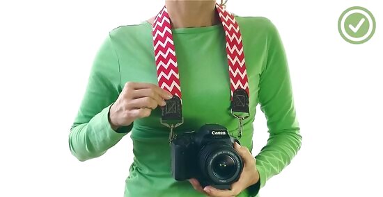 Clip both ends of the strap to your camera. Take the clasps attached to both ends of your strap and fasten them to the strap loops on your camera. Depending on the size of your metal hooks or clasps, you might not be able to fit your large hook around the loop. If this is the case, slide a metal ring onto each of these camera loops, and attach the metal hooks to these loops. Before going out with your camera, place the strap around your neck to see if it feels comfortable. If the material feels scratchy or weird, you might want to re-do or adjust the project with a piece of different fabric.