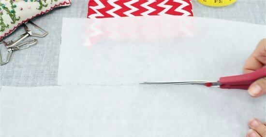 Trim a piece of fusible fleece that is 32 by 4 in (81 by 10 cm). Lay out a piece of fusible fleece onto a flat surface. Next, use a measuring tape to mark off the exact dimensions of your fabric strap, so the fleece can be layered on top. Once you’ve made these markings, cut out this section of material with a pair of fabric scissors. Fusible fleece is ironed on to different projects and helps make your strap sturdier. You don’t have to use this material in your strap—it just provides some extra dimension.