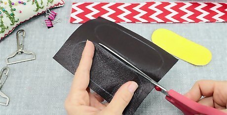 Cut out 2 curved rectangles from a sturdy fabric. Use a marker or pen to trace around your end piece template. Instead of using a soft fabric, trace these shapes onto a sturdier material, like vinyl or faux leather. After you’ve marked off the different shapes, cut them out with a pair of fabric scissors. A different type of fabric adds a nice contrast to the fabric you used for the strap.