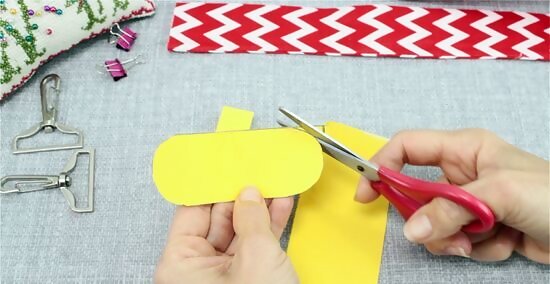 Trace 2 rounded rectangles that are 1½ by 4 in (3.8 by 10.2 cm). Use a piece of paper or cardstock to sketch out a rough template for the end pieces of your strap. Draw out a curved rectangle with rounded edges and long lines. As you sketch, check with the ruler to make sure that the template is 4 in (10.2 cm) across and 1½ in (3.8 cm) wide. Once you’ve completed this template, cut it out with a pair of scissors. You can use a variety of different shapes to design your end piece. If you don’t want to use a curved rectangle, try drawing and cutting out an hourglass shape that follows the same dimensions. You can find an exact template of the rectangular end pieces here: https://media.rainpos.com/5025/camerastrap_instrweb.pdf.