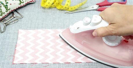 Iron the fusible fleece so it adheres to the strap. Set your iron to a wool fabric or steam setting, then press the appliance on top of the fleece. Work the iron in sections, holding it in place for 10 seconds so the fleece can fuse with the fabric. Continue moving the iron down the fabric strip until the fleece is fully attached. This might be easiest to do on an ironing board.