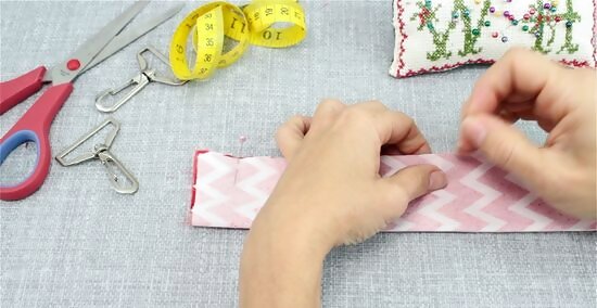 Fold and pin the long strip of fabric in half. Take your combined fabric and fleece and fold it lengthwise. Try to line up the edges as closely as possible, so the finished product doesn’t look uneven. Pin the folded material into place as you go, so the strap remains as even as possible. Any kind of pin can work for this project. If you’re new to sewing, consider placing the pins next to one another along the seam. If you’re more experienced, try spacing out the pins by 1 to 2 in (2.5 to 5.1 cm).