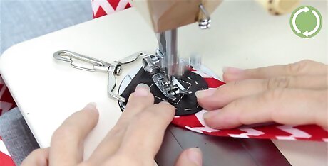 Stitch the folded edges together with a sewing machine. Feed the folded fabric through your sewing machine. As you stitch both sides of the fabric together, remove the pins and set them aside. Continue stitching down the length of the strap until you reach the opposite end. If there’s any excess thread, trim it off with a small pair of scissors. Your sewing machine might have a thread cutter attached to it; if so, feel free to use this tool.