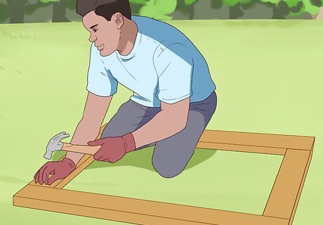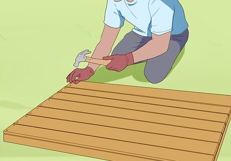 Form the gate frame. Place the four boards flat on the table to form a rectangle. Hammer them together so that the vertical boards rest inside the horizontal boards. If your gate is very tall, a center brace beam may also be necessary. For a sturdier gate, add a diagonal brace across the square. Instead of nailing the boards together, drill holes and connect them with carriage bolts.