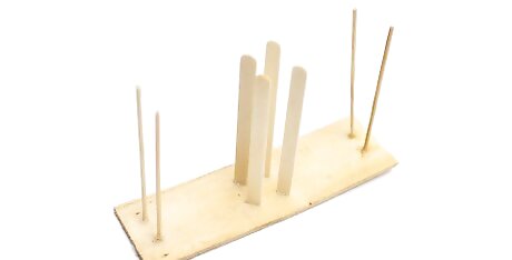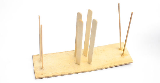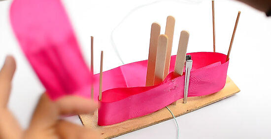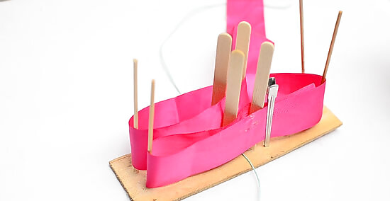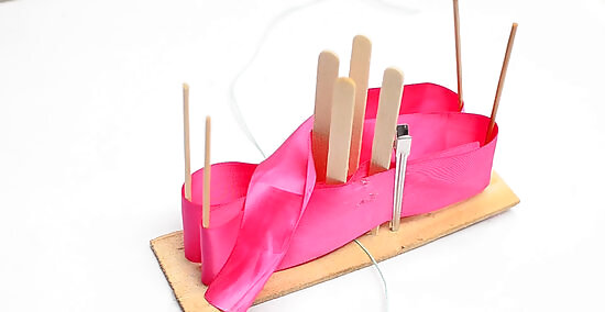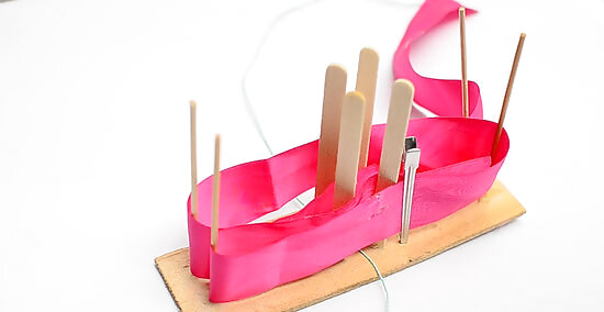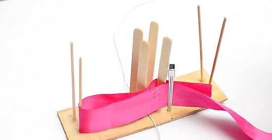 Bring the ribbon around the top-right rod, then pull it to the left side of the board. Pull the ribbon up and wrap it around the top-right rod. Bring it towards the left side of the board, placing it right between the top-left and top-right set of rods. Don’t thread this ribbon under the already-wrapped ribbon. Pull it across the top of the already-wrapped ribbon.
