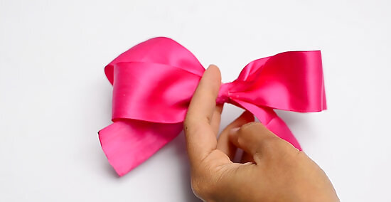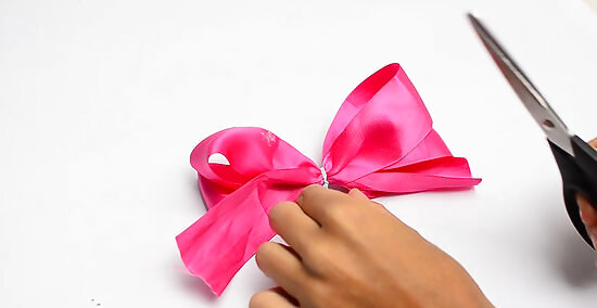 Tie a thin ribbon around the middle, then glue the ends to the back. Cut a 3 to 4 in (7.6 to 10.2 cm) length of ⁄8 in (1.6 cm) wide ribbon. Tie a knot in the middle, then hot glue it to the front of the bow. Wrap the ends to the back, overlap them, then hot glue them to each other to form a loop. Be careful not to actually glue the ribbons to the back of the bow. Gluing them together instead creates a tight loop for you to slide the clip into.