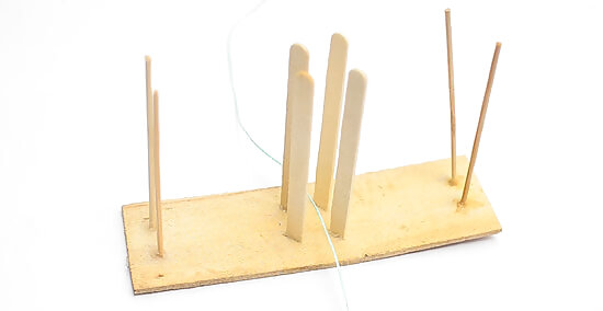 Place a piece of string between the rods in the middle of the board. Orient the board horizontally, with 1 of the long edges facing you. Drape the string vertically across the board, placing it right into the square formed by the 4 central rods. Cut the string about 6 to 8 in (15 to 20 cm) long so that it's long enough to wrap and tie around the ribbon. Baker's twine words great for this, but you can also use yarn or thin ribbon. If you choose to use ribbon, pick something that's no more than ⁄8 in (0.32 cm) wide.
