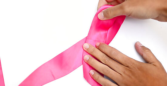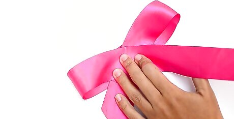 Bend the ribbon in half, then fold and crease the ends by 3 in (7.6 cm). Fold the ribbon in half first, so that the cut ends match up and make a V-shape. Next, fold the ends over at the same time by about 3 in (7.6 cm). Run your fingernail across the folded edge to create a crease. This crease is important because it will help you figure out where to overlap the ribbon later on. If you can't crease the ribbon, don't worry about it. You'll just have to eyeball the placement instead.