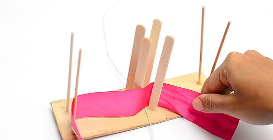 Pull the ribbon back towards the end and secure it with a clip. Wrap the ribbon across the front of the bottom-left rod on your board. Pull it across the front of the bottom edge of the square and towards the rod in the bottom-right corner of the square. Hold it against the end of the ribbon, and clip them together. Use a hair clip, bobby pin, or a clothespin to clip the ribbons together. If the end of the ribbon is too short, pull on it to make it longer. Don’t worry, you'll still have plenty of ribbon to work with.