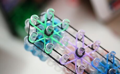 Make the first burst. Push all of the perimeter bands down. Then, place a band in Color A (whatever color you want) on the second peg of the middle row and the second peg of the right row. Then place five more bands going from the middle row peg to each of the surrounding pegs, in a clockwise motion. This should leave you with a starburst or asterisk shape.Make a Rainbow Loom Bracelet Step 14Bullet1 Version 3.jpg Push down all bands as you go.Make a Rainbow Loom Bracelet Step 14Bullet2 Version 3.jpg