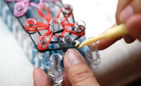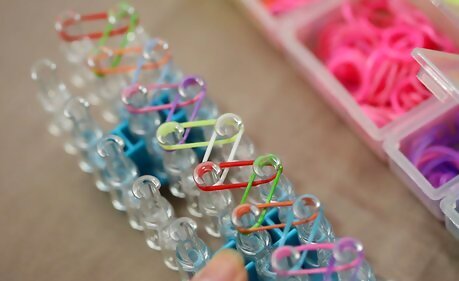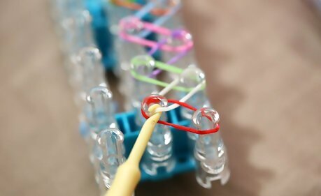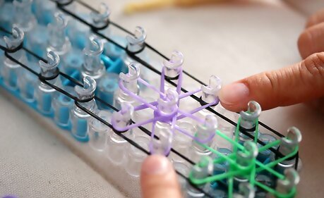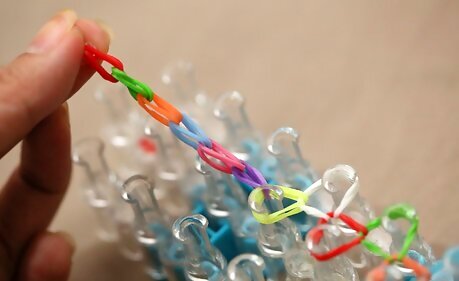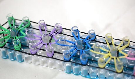 Start the weave. Turn the loom around so that the arrows are facing you. Then, hook the bottom loop of the closest starburst from the first middle peg and pull it up (careful not to dislodge the other bands on the peg)Make a Rainbow Loom Bracelet Step 17Bullet1 Version 3.jpg Loop it onto the center peg.Make a Rainbow Loom Bracelet Step 17Bullet2 Version 3.jpg