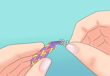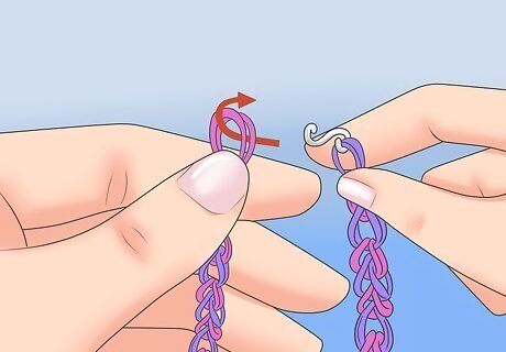 Add the C or S clip. Add a C or S clip to the last band on the loom, take the whole thing off of the loom, and then clip onto the loops on your hook.