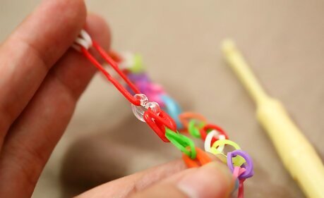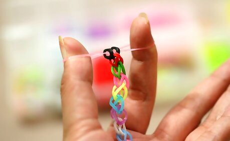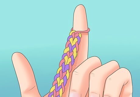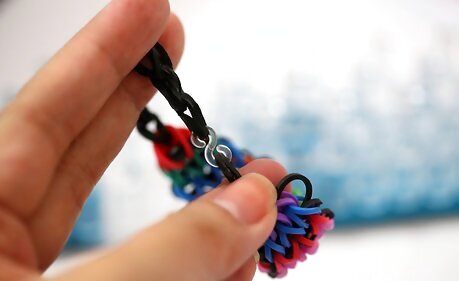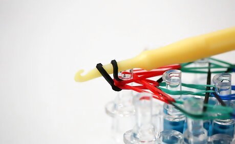 Add the end loop. Reach your hook down through all of the bands on the last middle peg. Grab a new band that you hold in your fingers, pull it up through the bands, and then slide your hook through the loop of the new band, so that it's completely wrapped around the hook.Make a Rainbow Loom Bracelet Step 20Bullet1 Version 3.jpg Then, holding the hook in your hand with the loop still around it, pull the whole bracelet off of the loom.Make a Rainbow Loom Bracelet Step 20Bullet2 Version 3.jpg