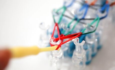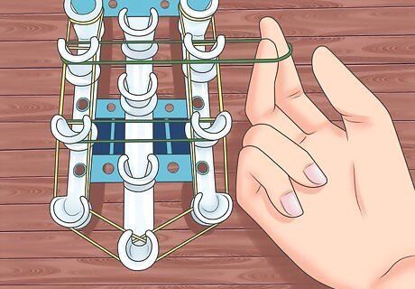 Take a colored band and take it from the bottom peg and stretch it up to the peg right above it. Do the same on all of the bottom pegs.