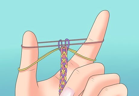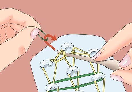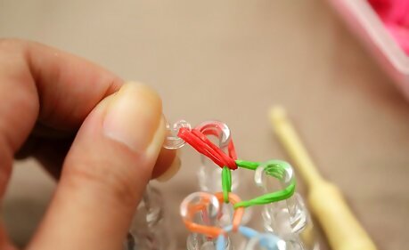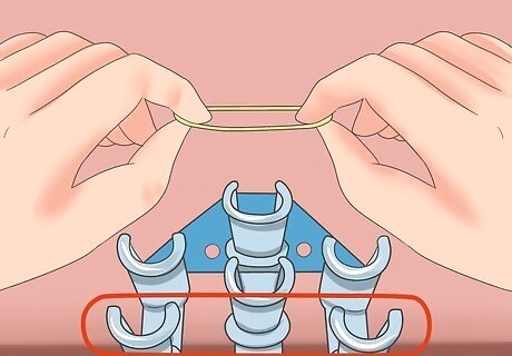 Place the band. Flip the band on your hook so that it bends in half (bent over the band above it) and place it over the second peg in the next row. Whether it is to the left or right depends on what you chose earlier.