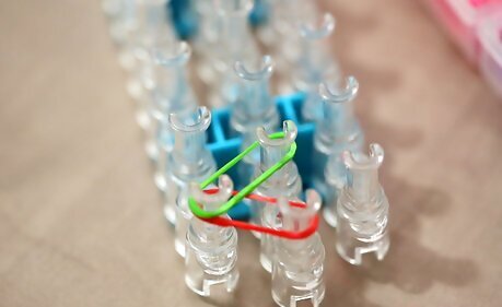 Place your bands that go through the middle set of pegs on your loom.
