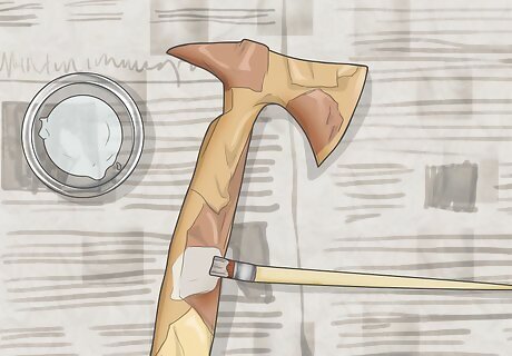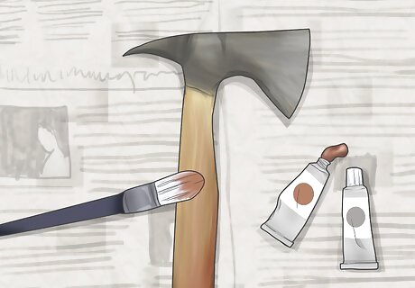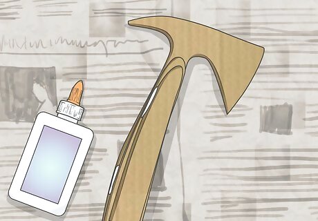 Apply some papier-mâché. To make the adhesive for your papier-mâché, you can dilute some normal all-purpose glue (sometimes called PVA glue) in a small amount of water. Use a paintbrush to apply your glue-water solution to your scrap paper and the surface of your cardboard tomahawk. For scrap paper, you might use thin brown paper, like the kind used for paper lunch bags or grocery bags. Cover the cardboard of your 'hawk so that it has a uniform appearance. To give a stone-like effect to your ax-head, you might want to crinkle the paper that you paste to it. To make the handle of your 'hawk appear wooden, you should try to glue your papier-mâché to the handle as smoothly as possible.