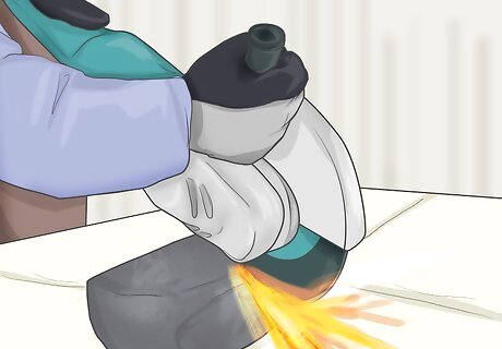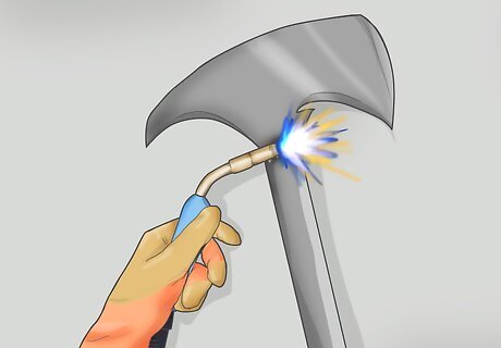 Attach the ax-head and handle. Prepare your welding equipment as you normally would, or seek the assistance of a skilled welder to guide you in the process. You will need proper safety gear, like a welding jacket, welding helmet, and a welding gloves. If you only require a welding refresher, check out how to weld. Once your equipment is prepared and your safety equipment put on, light your torch and weld your ax-head to your pipe handle.