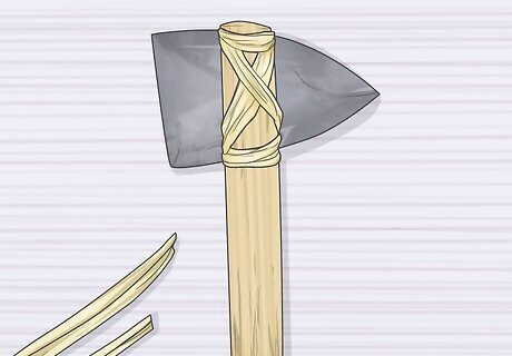 Wrap your sinew around the head of your tomahawk. In a figure-eight pattern, wind your sinew very firmly around either side of your tomahawk handle and the top and bottom of your ax-head. Your sinew should cross in an X shape on the flat sides of your stone.