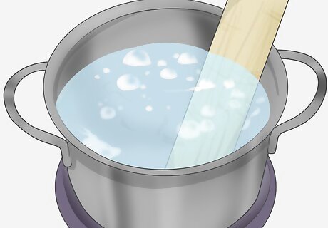 Soak the wood handle in boiling water. Take the slotted end of your handle and put it in boiling water to soften the wood. This will make it easier to attach the head of your tomahawk. Test the softness of your wooden handle with your pliers. If the wood bends with relative ease, you should be able to mold it around your ax-head.